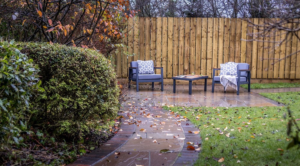 The private garden, with lawn, patio and outdoor furniture, for guests staying