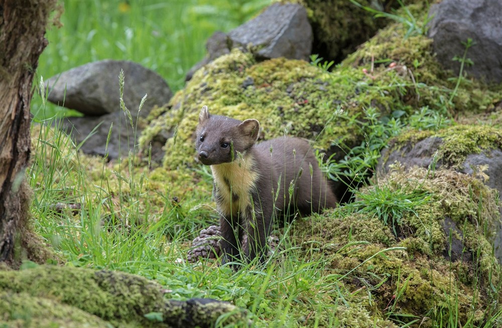 A pine marten is standing next to some mossy stones